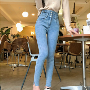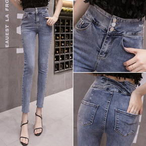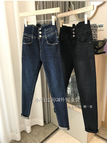 [欧玛莱]韩版秋季女两颗扣高腰深色系修身小脚裤牛仔...