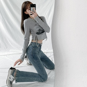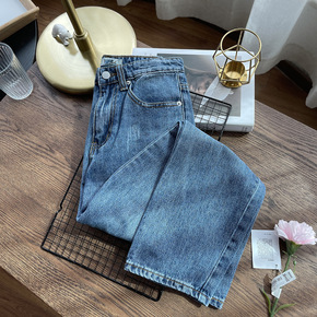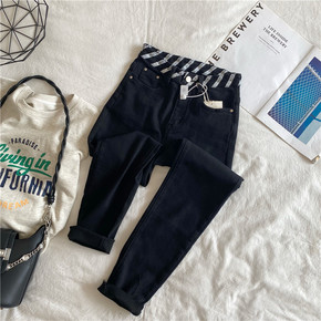 2021秋冬韩版中高腰弹力显瘦小直筒花边腰水洗深色...