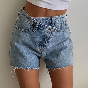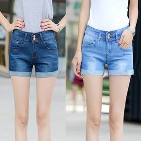 高腰2扣弹力直筒裤脚翻边牛仔女短裤双扣双色选批发 ...