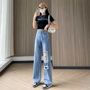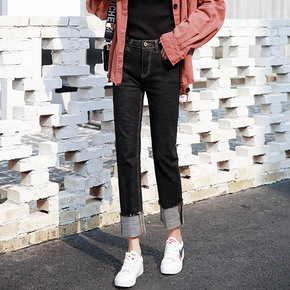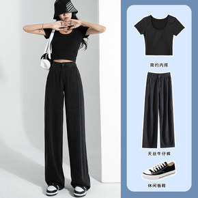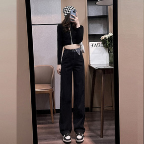 黑色高腰牛仔阔腿直筒裤女2022春秋季新款宽松别致...