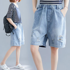 松紧腰牛仔短裤女阔腿裤2022新款夏季韩版显瘦破洞...
