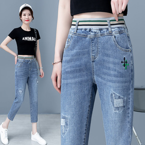 亿6662松紧腰刺绣牛仔七分裤子女直筒休闲显瘦弹力...