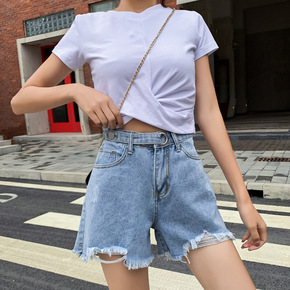 厂家高腰牛仔短裤女松紧腰收腰翻边阔腿裤短裤宽松20...