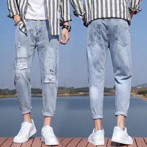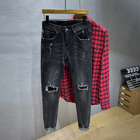 货源类别:现货 货号:K19 风格:高街 款式:铅笔裤/小脚裤 裤型:直筒型 特殊工艺:磨破...