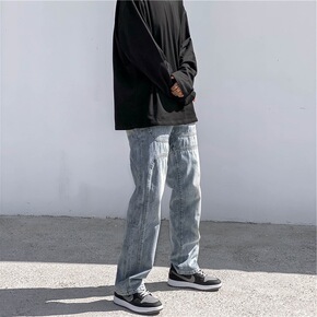 欧美高街浅色牛仔裤拼接直筒宽松坠感显瘦潮牌复古嘻哈...