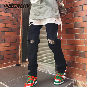 ins欧美高街百搭刀割膝盖破洞黑色修身小脚牛仔裤韩...
