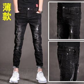 破洞九分牛仔裤男士弹力小脚潮牌显瘦裤子男黑色裤薄款...