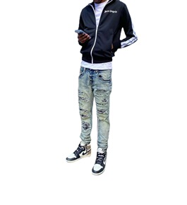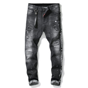 欧美新款男士跨境时尚破洞青年装脚口拉链弹力小脚男装...