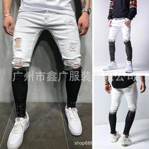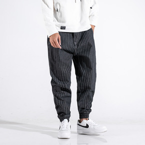 2019秋冬季黑色大码牛仔裤男士条纹潮流拼接哈伦裤...