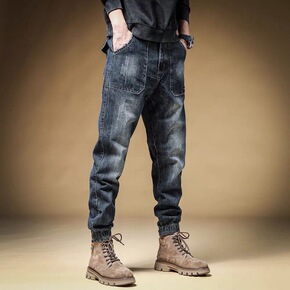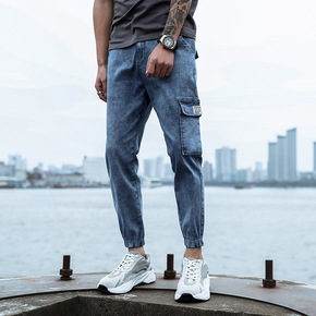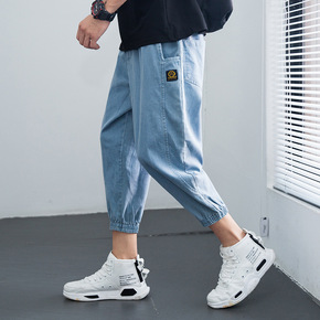 2021新款牛仔裤男松紧腰宽松哈伦束脚工装裤系绳休...