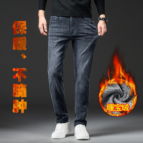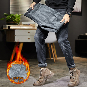男士秋冬季加绒加厚款束脚大码牛仔裤男保暖修身休闲工...