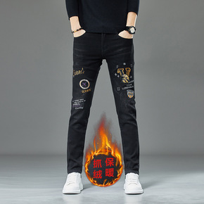 潮牌刺绣黑色显瘦弹力修身牛仔裤2021冬季厚款百搭...