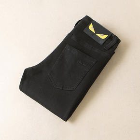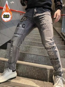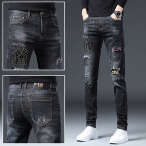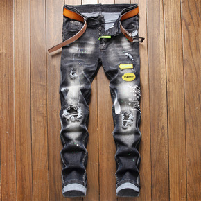 欧洲站高端秋冬加厚款牛仔裤男小直筒新款黑色小怪兽刺...