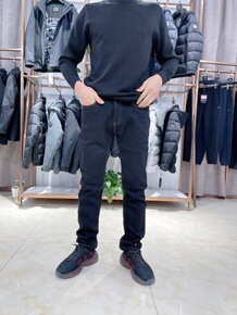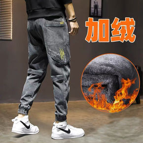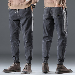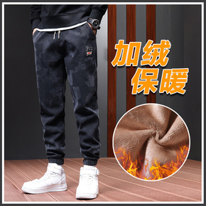 2021年新款加绒加厚牛仔长裤男士宽松束脚休闲裤秋...