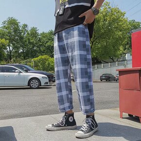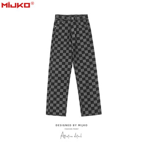 格子牛仔裤男港风直筒ins宽松坠感阔腿裤韩版潮流休...
