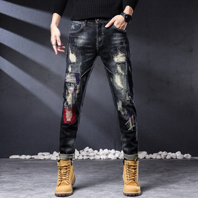 青少年刺绣破洞休闲高端欧货直筒修身中高腰水洗弹力棉...