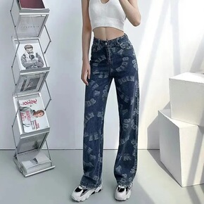 马思唯牛仔裤女秋季高街潮牌满印阔腿裤ins宽松休闲...