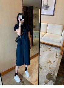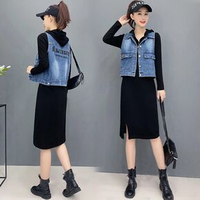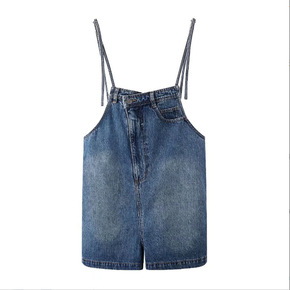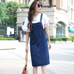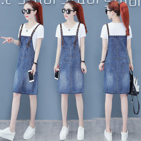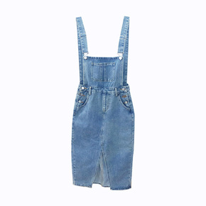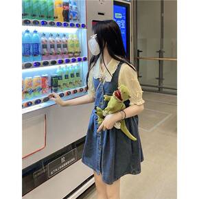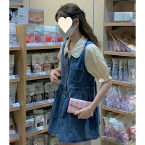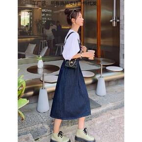 2022年新款法式韩版气质显瘦牛仔背带连衣裙洋气减...