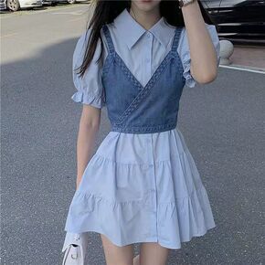 牛仔连衣裙女2022夏季新款学院风短裙收腰网红一字...