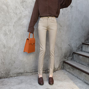 M10-9118秋季白色修身牛仔裤女高腰杏色休闲显...
