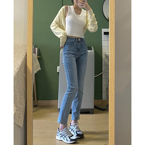 2021秋装韩版浅蓝色开叉牛仔裤女高腰显瘦显高垂坠...