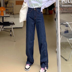 开叉直筒深蓝色牛仔裤女2021秋季新款复古宽松百搭...