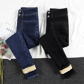 高腰弹力牛仔裤大码女裤秋冬三粒扣修身显瘦紧身百搭铅...
