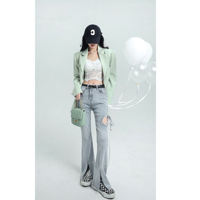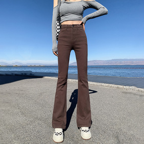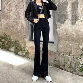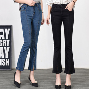 2022春夏新品韩版女装高腰九分喇叭裤开叉修身弹力...