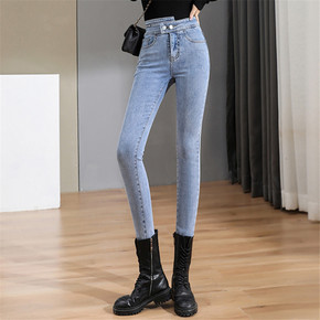 Q016牛仔裤女秋新款高腰亚马逊欧美磨白褶皱纽扣拉...