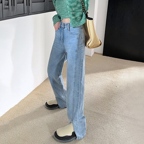高腰开叉牛仔裤春装2022年新款设计感显瘦阔腿裤微...