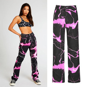 2021新款时尚欧美风街头潮流女装高腰修身紫色印花...