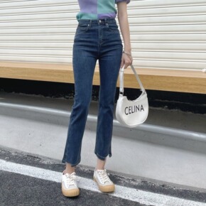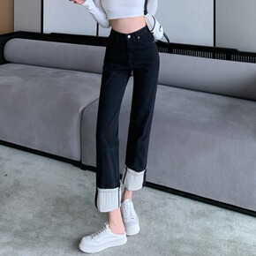 弹力高腰直筒九分裤牛仔裤女2021秋冬新款微喇设计...