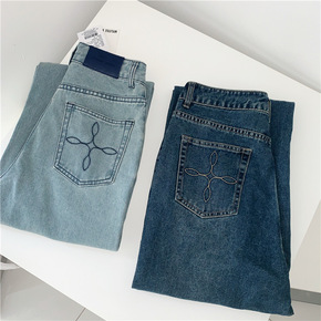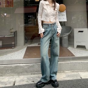 实拍~口袋印染宽松直筒牛仔裤女2021早秋新款垂感...