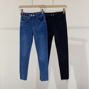 辰智腰部小设计两粒扣弹力牛仔裤高腰修身显瘦毛边小脚...