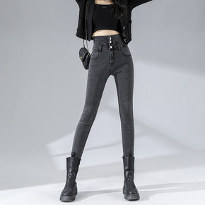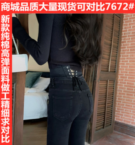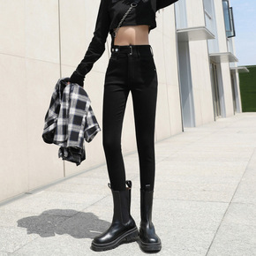 高腰牛仔裤女秋冬韩版弹力显高显瘦修身小脚铅笔裤双扣...