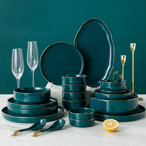 酒店餐厅祖母绿陶瓷餐具碗盘碟 家用ins金边饭碗鱼...