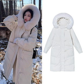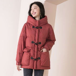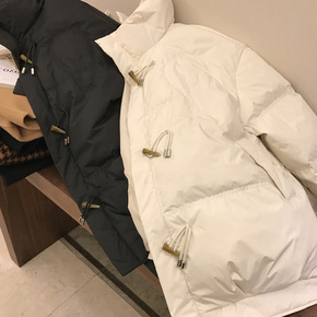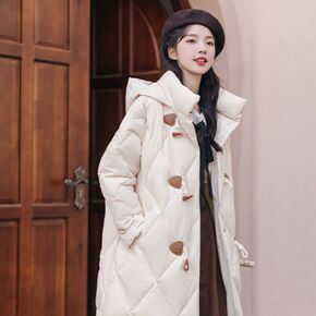 冬季新款韩版牛角扣中长款羽绒服女连帽白鸭绒加厚外套...