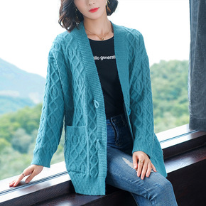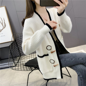 针织开衫女装中长款外搭秋季2021年新款宽松牛角扣...
