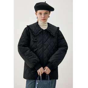 2021冬季百搭设计感黑色棉衣菱格娃娃领牛角扣短款...