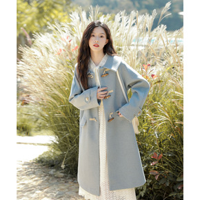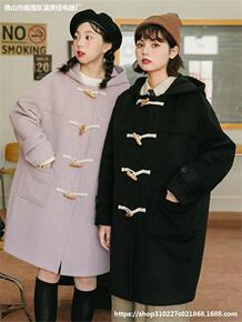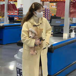 牛角扣呢子大衣202冬季新款韩版加厚连帽中长款毛呢...