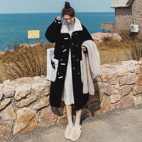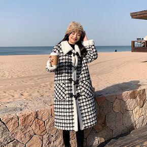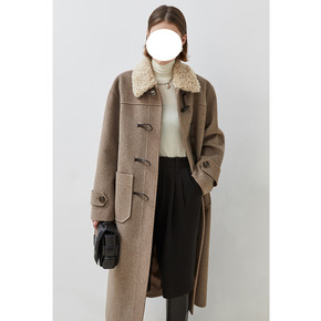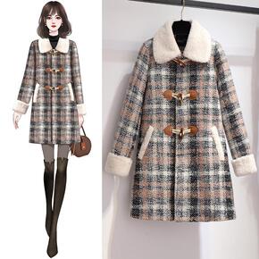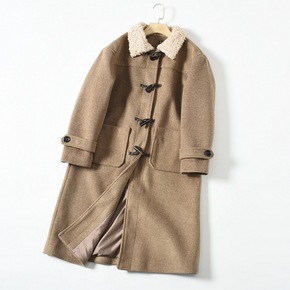 2021年冬季复古中长款仿羊羔毛呢子大衣牛角扣拼接...