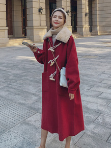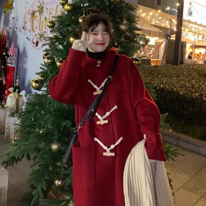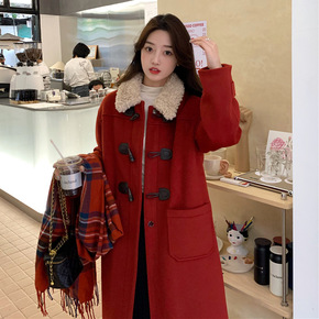 圣诞红色毛呢外套冬季韩版2021新款加厚保暖毛领中...