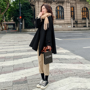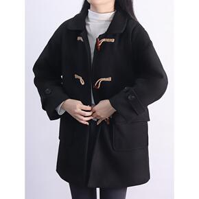 黑色牛角扣呢子大衣春秋2021年新款毛呢外套女中长...
