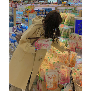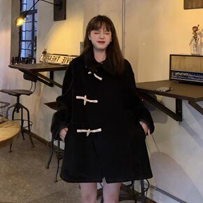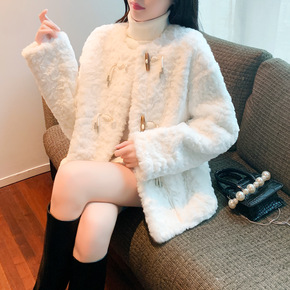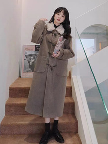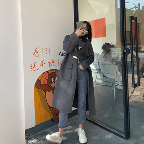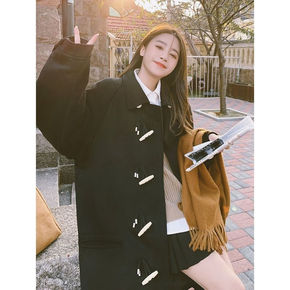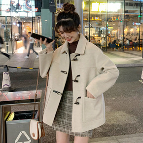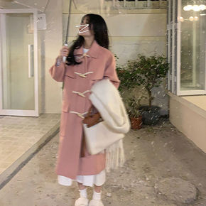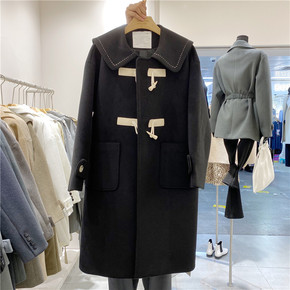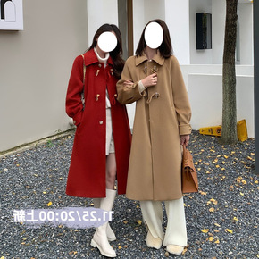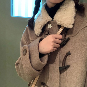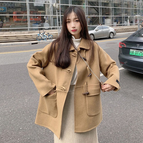 韩系羊羔毛牛角扣毛呢外套女中长款2021年秋冬季新...