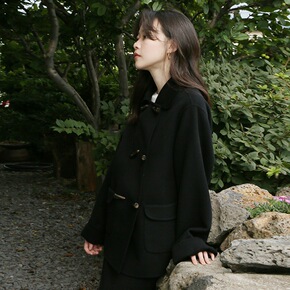 肉完黑色斗篷双面呢大衣女2021年新款小个子韩系牛...