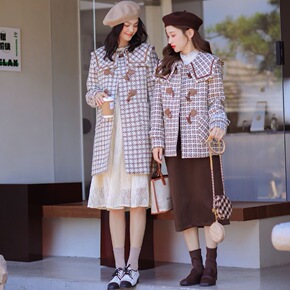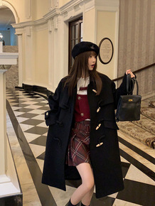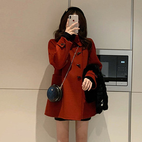 牛角扣毛呢外套女2021秋冬新款小个子赫本风中长款...