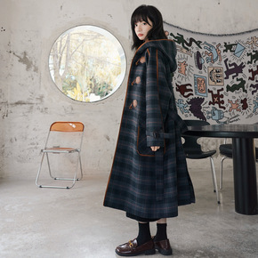 格子毛呢外套女中长款过膝2021秋冬新款韩版连帽厚...