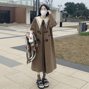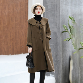 毛呢大衣女中长款秋冬新款韩版宽松牛角扣娃娃领过膝风...
