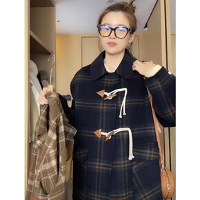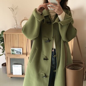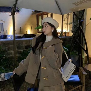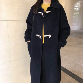 呢子大衣女秋冬款学生韩版宽松显瘦牛角扣小个子中长款...