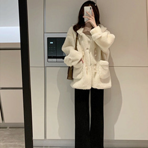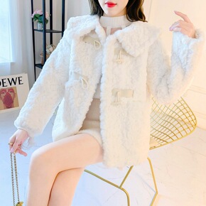 羊羔毛牛角扣连帽外套女2022冬季新款韩版宽松中长...